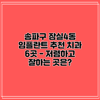 송파구 잠실4동에서 임플란트 시술을 받기 위한 치과 선택은 여러 요소를 고려해야 하는 중요한 결정이에요. 추천 드린 임플란트 BEST 치과 6곳은 전문성과 가격 그리고 후기 좋은 곳으로 구성되어 있습니다. 임플란트 시술 비용은 치과에 따라 다르며, 평균적으로 100만 원에서 300만 원 사이입니다. 상담 후 정확한 견적을 받는 것이 중요해요. 지금 바로 여러분의 치아 건강을 위해 신뢰할 수 있는 치과를 선택하고, 건강한 미소를 되찾아 보세요! 💡